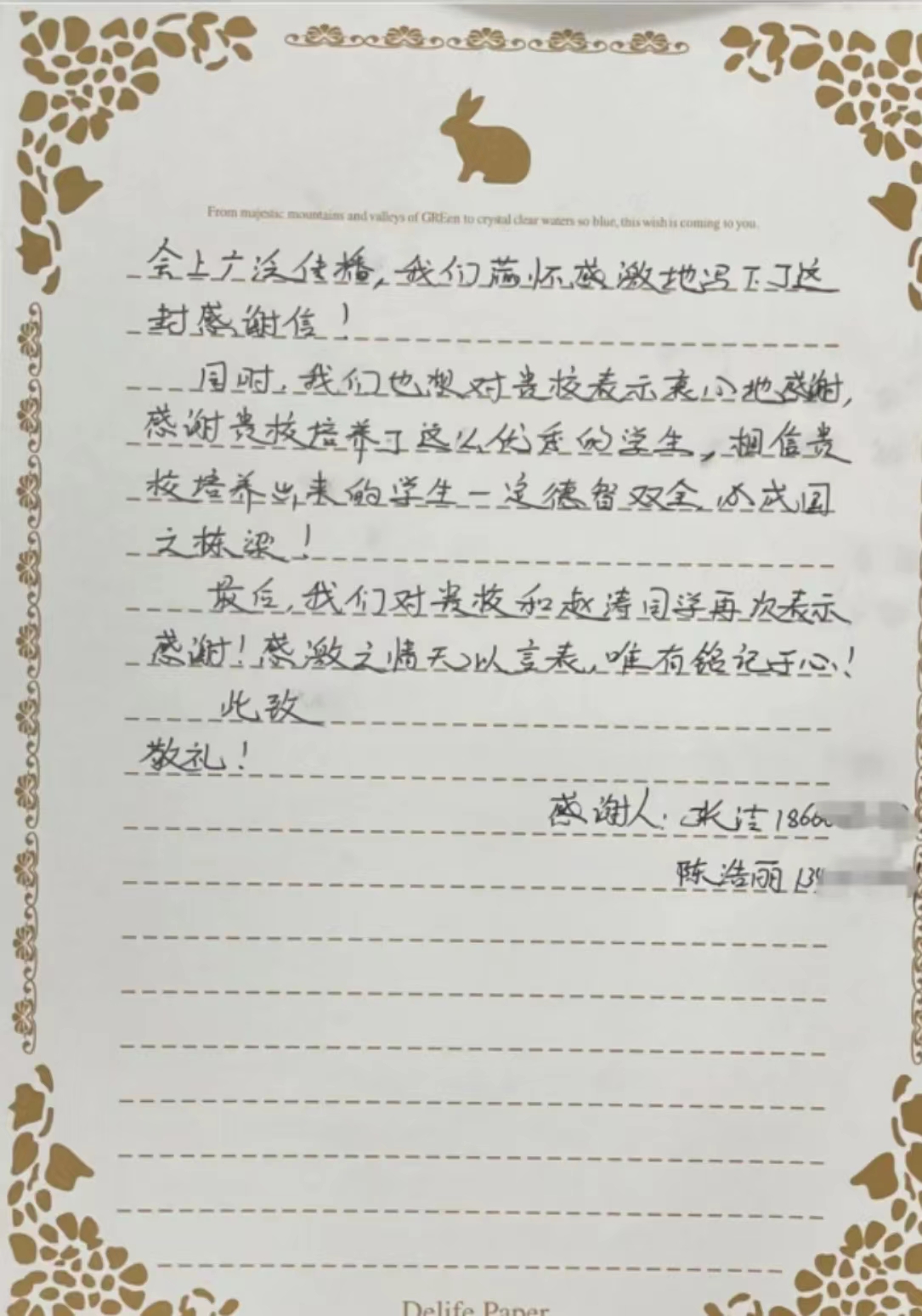 在感谢信中,陈浩丽和张洁这样写道:都说现今的社会被物欲横流,雷锋精神渐行渐远,然而在现场,在赵涛同学身上,雷锋精神却体现得淋漓尽致,这种温情如此温暖人心,赵涛同学舍己救人的行为已经在孩子们心中播下了善良的种子,同时也让我们成年人更加坚定地去坚守那份善良和勇敢。“谢谢你,同学,再次感谢。”