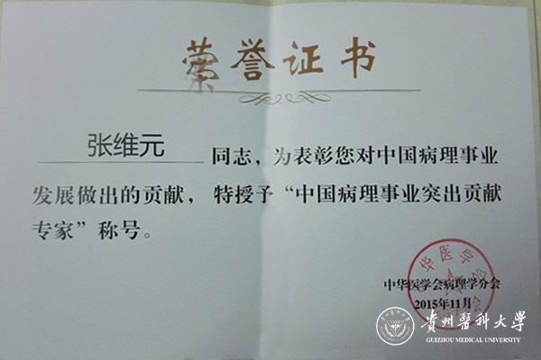 鉴于张维元教授对中国病理事业发展做出的杰出贡献,中华医学会病理学分会授予“中国病理事业突出贡献专家”称号。在2016年贵州省首届病理学术会议上,省病理学会对张维元教授的事迹进行了表彰。张维元教授对病理事业执着追求的精神将是一座灯塔,照亮着前行的路,激励着后辈们为病理事业的不断发展而努力奋斗!