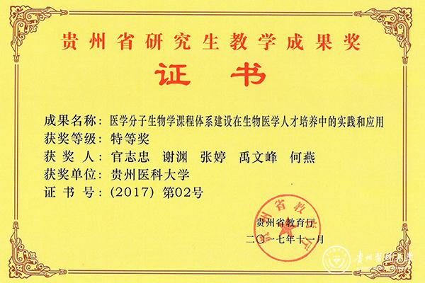 近日,贵州省教育厅颁发了第二届贵州省研究生教学成果奖证书,beat365分子生物学重点实验室官志忠教授主持的“医学分子生物课程体系建设在生物医学人才培养中的实践和应用”荣获特等奖,成果获奖人有:官志忠、谢渊、张婷、禹文峰、何燕。