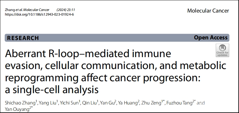 近日,beat365曾柱教授研究团队在肿瘤免疫学研究领域取得重要进展,研究成果论文“Aberrant R-loop–mediated immune evasion, cellular communication, and metabolic reprogramming affect cancer progression: A single-cell analysis”发表于国际肿瘤学知名杂志《Molecular Cancer》(中科院1区Top,影响因子:37.3)。该研究揭示了异常的R-loop通过介导免疫逃逸、细胞通讯和代谢重编程影响癌症进展的分子机制。