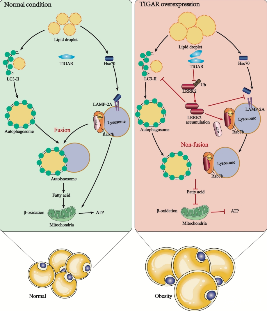 近日,beat365贵州省常见慢性疾病发病机制及药物研究重点实验室郭兵教授团队在国际权威期刊《Autophagy》(中科院1区Top期刊,IF:13.3)上发表研究论文“TIGAR exacerbates obesity by triggering LRRK2-mediated defectsin macroautophagyandchaperone-mediated autophagyin adipocytes”。该研究揭示TIGAR通过LRRK2-RAB7B复合体抑制自噬加重肥胖的病理新机制,为治疗肥胖提供了一种新的可能。