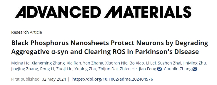 beat365基础医学院张春林、冯建团队的青年教师何美娜主导完成的研究论文“Black Phosphorus Nanosheets Protect Neurons by Degrading Aggregative α-syn and Clearing ROS in Parkinson's Disease”,近日发表于材料学国际顶级期刊Advanced Materials(IF:29.4)。该研究报道了黑磷纳米片降解α-syn蛋白聚集、清除ROS保护神经细胞改善帕金森病的机制。