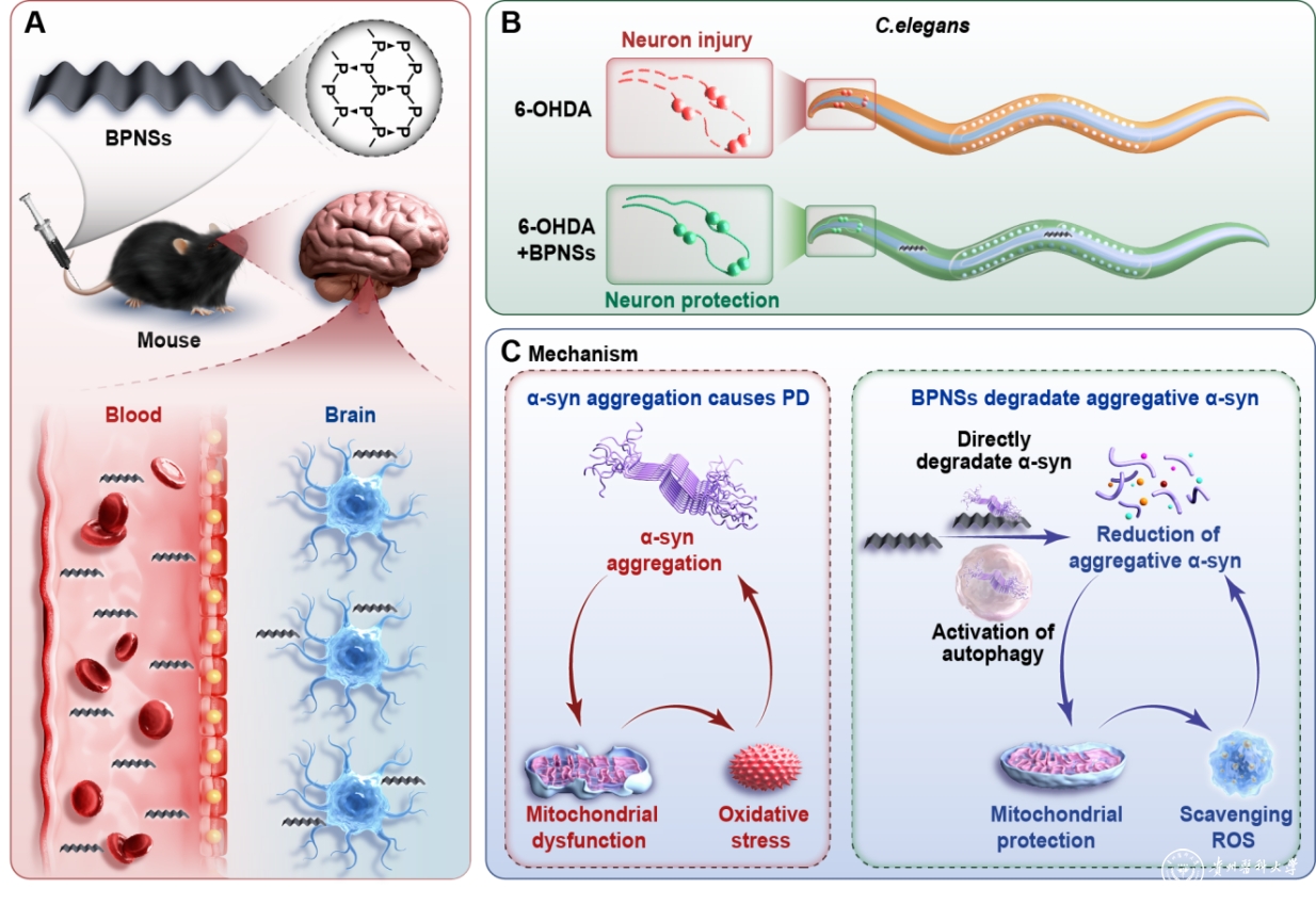 A.BPNSs穿过血脑屏障示意图。B.BPNSs在线虫模型中的神经保护作用。C.BPNSs降解α-syn聚集以及清除ROS保护神经细胞改善帕金森疾病的分子机制。