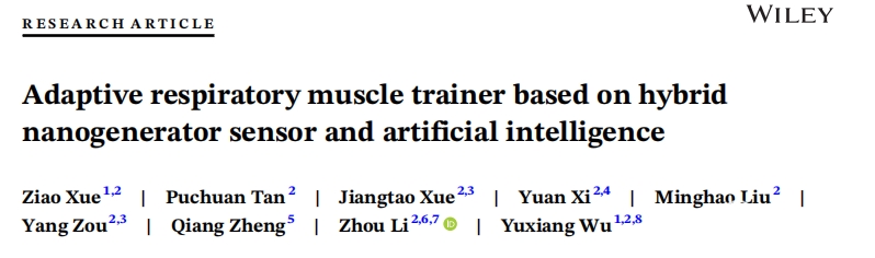 近日,生物与工程学院(健康医药现代产业学院)曾柱教授和郑强教授领衔的生物电子系统团队联合江汉大学和中国科学院北京纳米能源研究所开发了一款人工智能辅助的自适应呼吸肌训练设备,该成果已在《Infomat》(影响因子:22.7)期刊上发表。该设备通过结合先进的混合纳米发电传感器技术和智能算法,实现了对呼吸状态的精准感知与阻力的自动调节,为运动员、慢性呼吸系统疾病患者以及健康恢复中的人群提供了一种更加科学、便捷的训练方式。