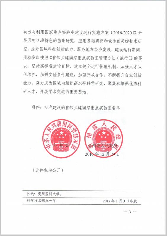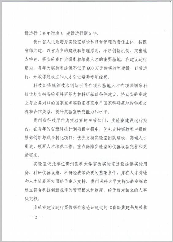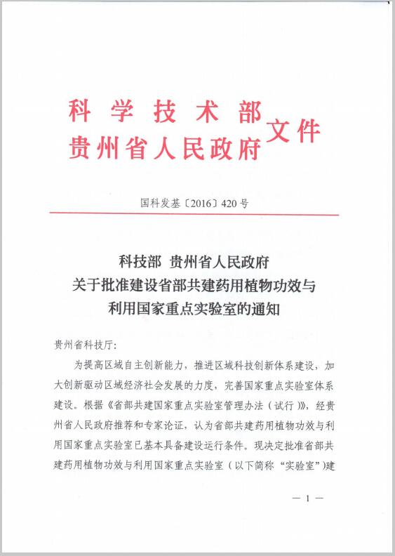 近日,国家为了进一步提高区域自主创新能力,推进区域科技创新体系建设,加大创新驱动区域经济社会发展的力度,完善国家重点实验室体系建设,科学技术部、贵州省人民政府决定批准省部共建药用植物功效与利用国家重点实验室,省部共建药用植物功效与利用国家重点实验室的主任为何志旭教授、依托单位为beat365在线唯一官网、主管部门为贵州省科技厅、建设和日常管理的责任主体为贵州省人民政府。省部共建药用植物功效与利用国家重点实验室获得正式批准标志着beat365在线唯一官网科研平台建设和学科建设又迈上了一个更高更新的台阶。