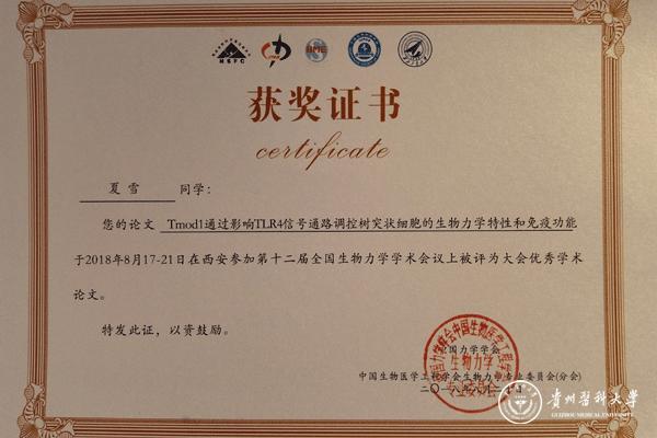 2016级生物医学专业硕士研究生夏雪在研究生论文评比分会场做了题为《Tmod1通过影响TLR-4信号通路调控树突状细胞的生物力学特性和免疫功能》的报告,获评优秀学术论文。