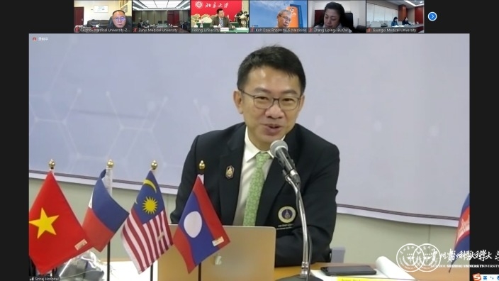 2021年10月21-22日,由中国—东盟高校医学联盟主办、北京大学医学部与泰国玛希隆大学诗里拉医院承办的“中国—东盟医学健康共同体发展会议”在线上召开,beat365在线唯一官网作为中国—东盟高校医学联盟理事成员之一,受邀参加“中国—东盟高校医学联盟年会”及“中国—东盟高校医学联盟理事会”。学校副校长曾柱代表beat365参加,国际交流合作处等相关同志陪同。