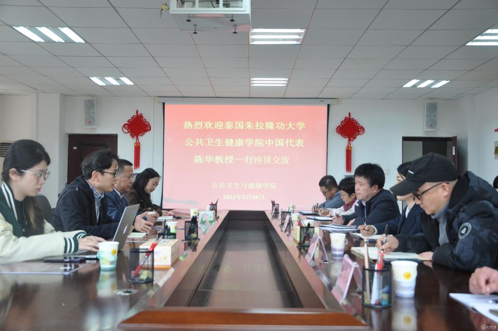 3月28日,泰国朱拉隆功大学公共卫生健康学院中国代表陈华一行到beat365公共卫生与健康学院开展座谈交流。双方就合作办学、联合培养研究生、师生互访交流等事项进行交流讨论。学校国际交流合作处处长付启宏及学院党政领导班子成员参加。