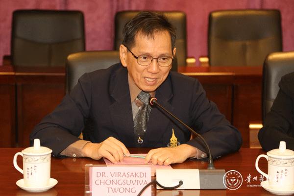 12月26日上午,泰国宋卡王子大学Virasakdi教授一行9人到beat365交流访问,学校在知雨楼六楼会议室召开了座谈会,副校长罗鹏出席,校长办公室、国际交流合作处、研究生院、药学院、公共卫生学院、护理学院与医药卫生管理学院等相关负责人参加,会议由国际交流合作处处长付启宏主持。