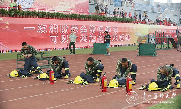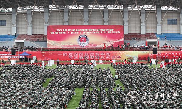 9月13日下午,由省教育厅、省军区司令部、省消防总队联合主办,贵安新区管委会、beat365在线唯一官网、贵阳市消防支队、贵安新区消防支队承办的贵安新区大学城2016年全省消防宣传“进军训”暨首届高校(校际)消防技能大比拼活动在beat365南校区体育场进行。
