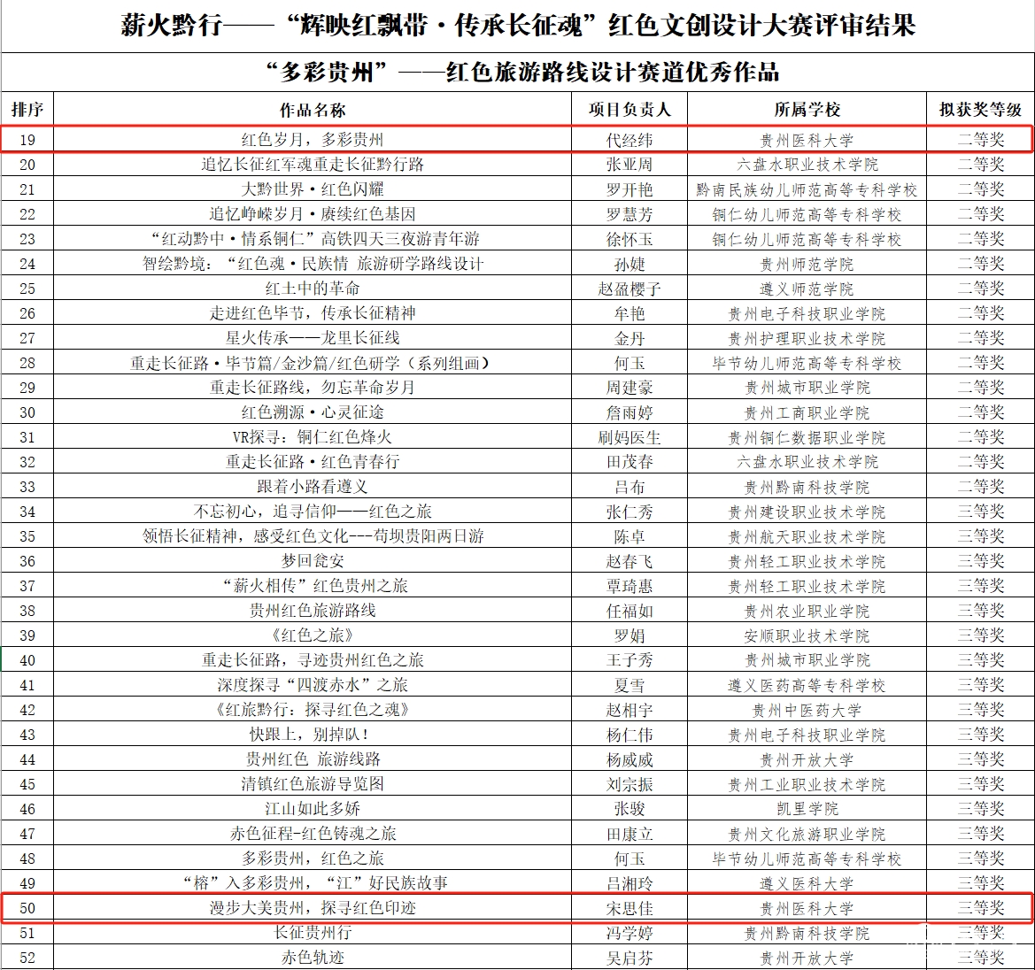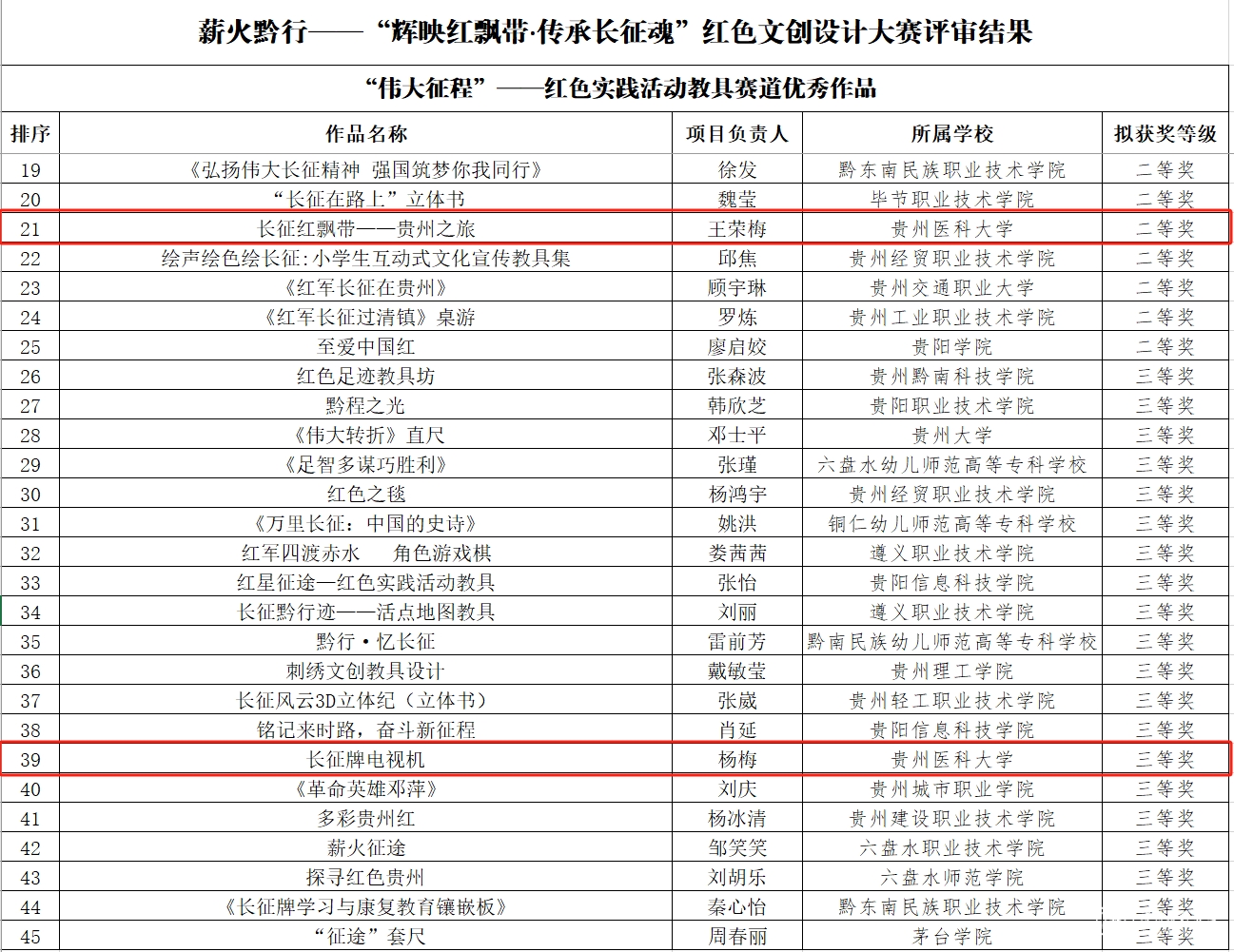 近日,省委宣传部、省委教育工委、省教育厅、省文化和旅游厅举办的薪火黔行——“辉映红飘带·传承长征魂”红色文创设计大赛公示评审结果。beat365在此次大赛中获奖4项,其中“伟大征程”——红色实践活动教具赛道荣获二等奖1项,三等奖1项;“多彩贵州”——红色旅游路线设计赛道二等奖1项,三等奖1项。张鑫、代泽斌荣获“优秀指导教师”称号。
