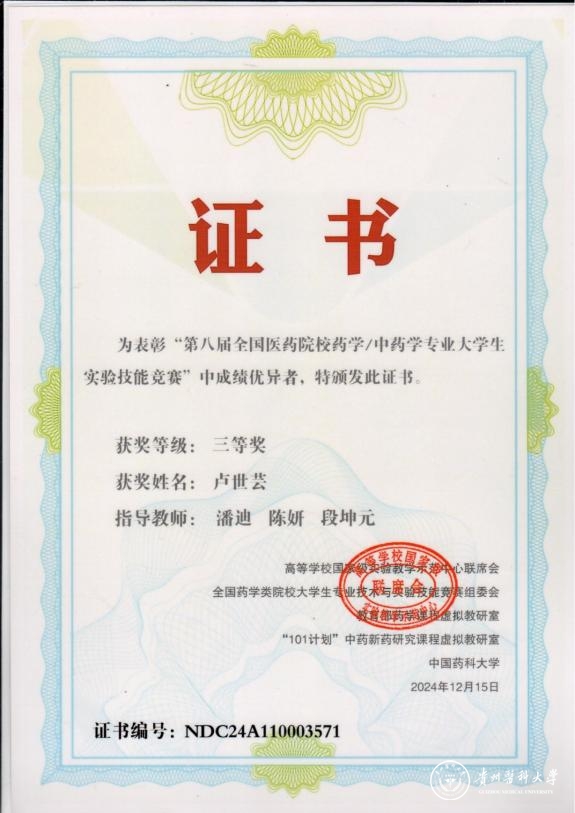 经过涵盖十余门专业基础课、专业课的理论知识和实验操作技能的综合比拼,beat3652022级药学1班冷小敏获得国家级一等奖,2021级临床药学卢世芸获得国家级三等奖。