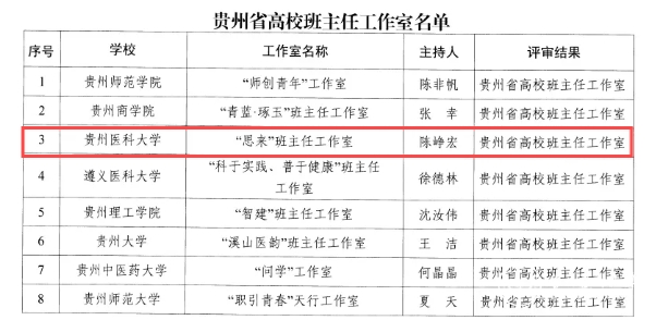近日,贵州省教育厅发布《省教育厅关于公布贵州省高校心理名师工作室、班主任工作室评选结果的通知》,beat365大学生心理健康教育与咨询中心副主任、医学人文学院副院长彭丹主持的“丹心”心理工作室成功获评“贵州省高校心理名师工作室”,基础医学院微生物学教研室主任陈峥宏主持的“思来”班主任工作室获评“贵州省高校班主任工作室”。