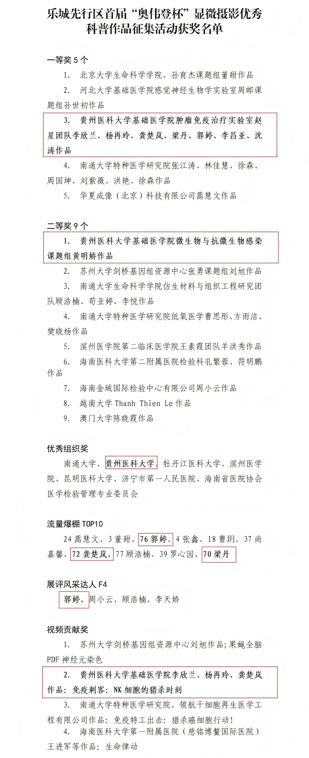 8月18日,海南乐城先行区首届“奥伟登杯”显微摄影优秀科普作品评审结果发布会暨第二届显微摄影征集活动启动仪式在海南国际医学中心举行。beat365研究生团队表现突出,荣获多个奖项。基础医学院肿瘤免疫治疗实验室赵星团队李欣兰、杨再玲、龚楚岚、梁丹、郭婷、李昌亚、沈涛作品获一等奖;基础医学院微生物与抗微生物感染课题组团队黄明娇作品获二等奖。李欣兰、杨再玲、龚楚岚团队创作的科普视频《免疫刺客:NK细胞的猎杀时刻》获视频贡献奖。郭婷、龚楚岚、梁丹等人入选“流量爆棚TOP10”,郭婷获“展评风采达人”称号。学校获优秀组织奖。