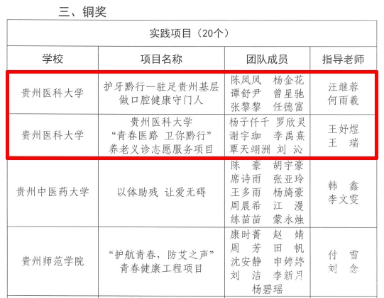 近期,由省委社会工作部、团省委、省教育厅共同举办的贵州省第二届高校志愿服务专项大赛奖项发布。beat365基础医学院“无声课堂:遗体捐献知识科普与缅怀志愿服务项目”获实践赛道金奖;基础医学院“丝带护航,医路安康——‘协和+贵医’蓝丝带共建项目青年志愿服务项目”、生物与工程学院(健康医药现代产业学院)“‘绣绣’和她的动物朋友们”分别获孵化和文创赛道银奖;口腔医学院“护牙黔行——驻足贵州基层做口腔健康守门人”、beat365在线唯一官网“青春医路卫你黔行”养老义诊志愿服务项目、生物与工程学院(健康医药现代产业学院)“智汇贵娃—‘AI+屯堡文化’赋能乡村教育振兴志愿服务项目”分别获实践和孵化赛道铜奖。