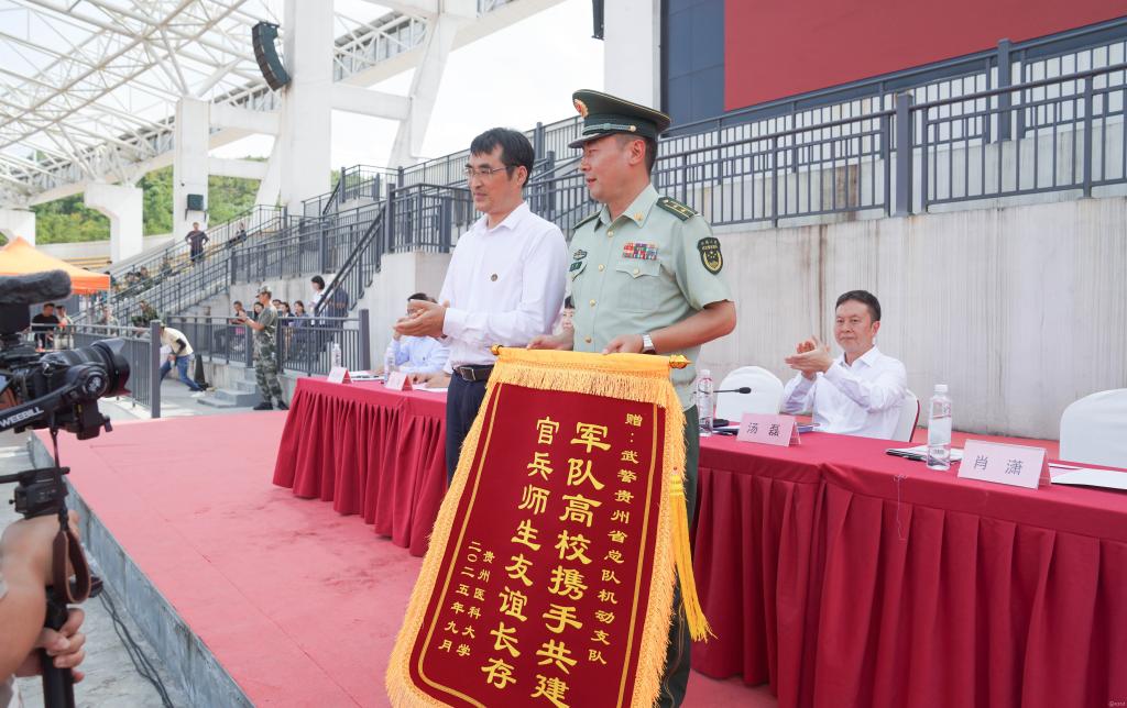 校党委副书记、校长罗鹏教授向武警贵州总队机动支队赠送锦旗。