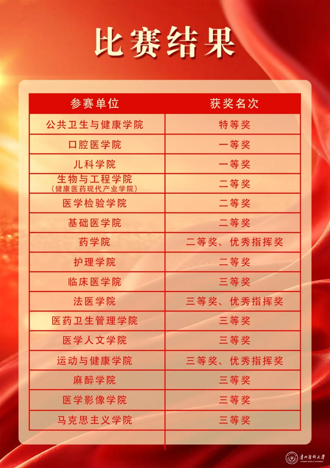 经过三个多小时的激励角逐,比赛结果揭晓:公共卫生与健康学院荣获特等奖;口腔医学院、儿科学院荣获一等奖;生物与工程学院(健康医药现代产业学院)、医学检验学院、基础医学院、药学院、护理学院荣获二等奖;临床医学院、法医学院、医药卫生管理学院、医学人文学院、运动与健康学院、麻醉学院、医学影像学院、马克思主义学院荣获三等奖。运动与健康学院陆倩、法医学院刘海槟、药学院施耀竺荣获优秀指挥奖。