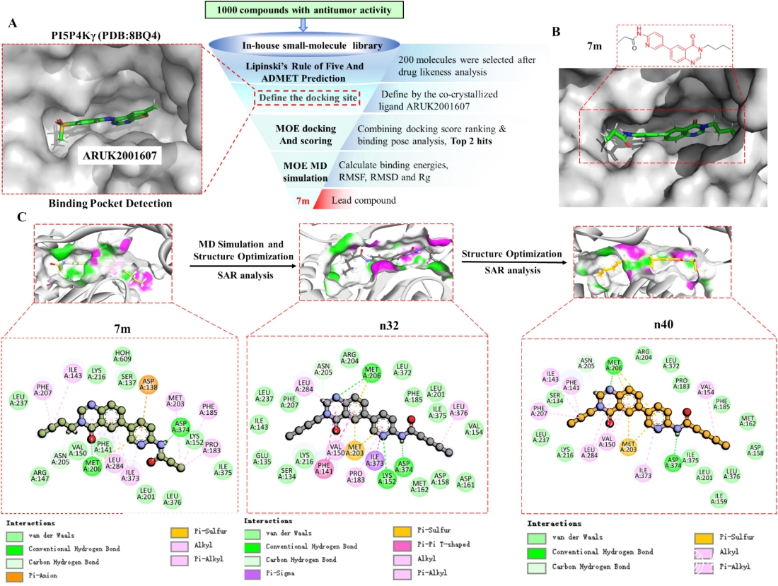 汤磊/范艳华团队选择以PI5P4Kγ晶体结构(PDB: 8BQ4)作为受体,采用分子对接虚拟筛选策略,从实验室自建化合物库的1000化合物中筛选出苗头化合物7m。随后采用基于分子动力学模拟和构效关系分析,经多轮结构优化,最终获得高选择性PI5P4Kγ抑制剂n40。化合物n40不仅对PI5P4Kγ也表现相互纳摩尔水平高亲和力(Kd=6.5 nM),同时具有高选择性(对α和β两种亚型的选择性超过3000倍)。此外,其在PI5P4Kγ高表达的NSCLC细胞中显示出更高的抗增殖活性(IC50=37nM)。n40与PI5P4Kγ的复合物共晶结果显示,n40能同时结合到PI5P4Kγ的正构位点和一个新的变构口袋。机制研究表明,n40以PI5P4Kγ依赖的方式诱细胞周期阻滞和凋亡,抑EMT及PI3K/AKT/mTOR信号通路。在体内移植瘤中,n40表现出大于60%的抑瘤率,且未观察到明显的毒性。