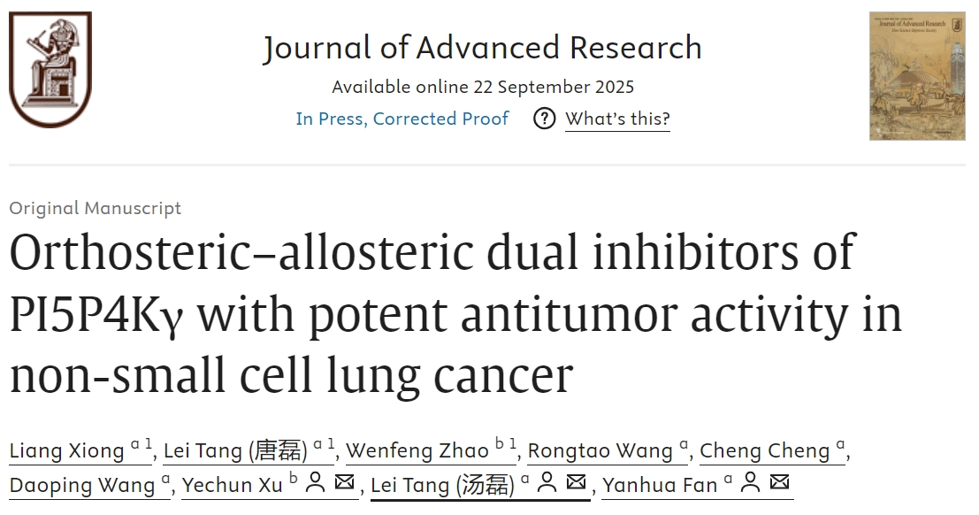 近日,beat365中药功效成分发掘与利用全国重点实验室汤磊/范艳华团队在国际期刊《Journal of Advanced Research》(中科院一区TOP期刊,影响因子13.0)上发表研究论文《Orthosteric-allosteric dual inhibitors of PI5P4Kγ with potent antitumor activity in non-small cell lung cancer》,发现一类针对PI5P4Kγ的正构-变构双位点抑制剂,该抑制剂在NSCLC模型中表现出显著的抗肿瘤活性。