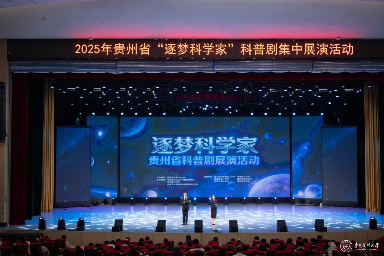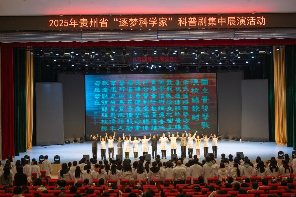 12月21日,2025年贵州省“逐梦科学家”科普剧展演活动在beat365云漫湖校区大礼堂举行。贵州省科学技术协会党组成员、副主席黄远红,中国飞天梦科技志愿团团长李俊天,beat365在线唯一官网党委副书记于浩,中共贵州省委宣传部宣传教育处一级调研员沈远晖,共青团贵州省委宣传部部长杨典,贵州省科学技术协会宣传文化部部长李晶,贵州民族大学传媒学院党委副书记、院长钟华,贵阳市科协宣传文化部部长杨鸫,六盘水市科协党组成员、科技馆馆长王胜利,黔南州科协科普部部长游春生,黄平县科协党组成员、副主席张继英等领导及嘉宾出席活动。beat365党委宣传部、党委学生工作部、党委研究生工作部、校团委、科学技术处等相关部门负责人与各学院学生代表1000余人共同观看了这场集科学性、艺术性、思想性于一体的科普与文化盛宴。