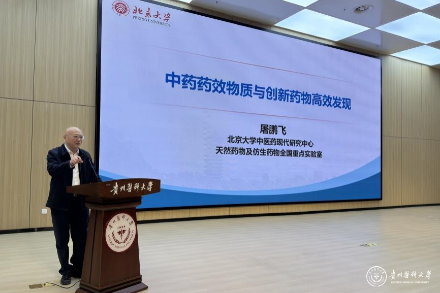 2026年1月5日,中药功效成分发掘与利用全国重点实验室、药学院、科学技术处联合主办的药韵黔行创新论坛2026年首期活动在云漫湖校区道德讲堂举行。本期论坛特邀北京大学屠鹏飞教授作学术报告。副校长潘卫东教授主持。校党委常委、副校长禹文峰教授,中药功效成分发掘与利用全国重点实验室、药学院党政领导,以及药学学科的教师代表、研究生共计250余人参加本次学术活动。