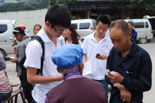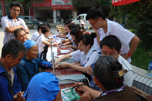 活动期间,参加服务团的志愿者们走访了昌明镇附近的九百户村、秀河村、尖山银村、新安村等五个村落,为当地老百姓们测量血压、进行健康咨询,同时了解当地医疗卫生状况、农民参加合作医疗的情况、文化程度以及当地居民对一些常见病认知程度的现状。并向他们作“常见疾病预防知识”科普宣传,散发结核病与艾滋病的知识宣传单。并将学校购置的近千元的常用药品,免费向两村乡亲发放。