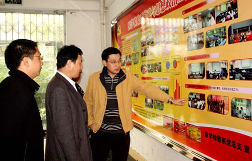 11月10日,党委书记赵明仁教授莅临检验系走访调研,在认真听取了系党政领导班子近期对学制调整研讨、产前诊断中心建设、教学科研等工作汇报后,赵书记认为,医学检验系班子和谐、工作思路清晰、工作热情高涨,服务第一的工作理念明确,发展趋势良好。同时希望,检验系今后在调整办学思路等工作中,要充分发扬民主、注重教材建设、培养方案的调整,以及教学资源分配等的有机结合,要以教学为根本、科研为载体、培养人才为高等教育的根本任务,努力提升人才培养质量,并鼓励全体教师做好当前检验系产前中心建设等工作,要化竞争为动力,要有自信,凭实力取得好的成果,把社会效益放在第一位,实现社会效益、经济效益双丰收。