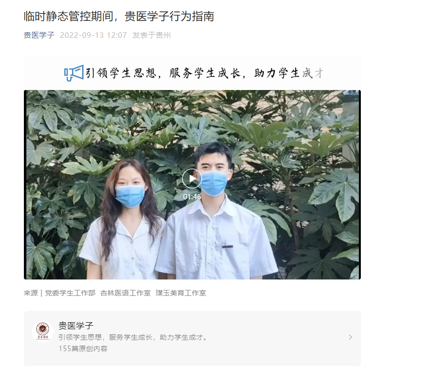 “夙兴夜寐筑防线,守望青春共克艰”是此次特刊的主题。为了让同学们有序流动、安心生活、有效学习,辅导员们化身主播录制《大规模核酸检测如何防范》《静态管控期间在校就医指南》《静态管控期间贵医学子行为指南》《正确上网课姿势》等视频作品,宣传疫情防控相关知识,帮助解决静默期间的困惑和困难,让同学们感受到了关怀和温暖,拉近与学生“心与心”的距离。“虽然是静默期间,但我们仍然能保持生活学习有序,辅导员方方面面的关心让大家有了安全感。”学生郭雨兴说。