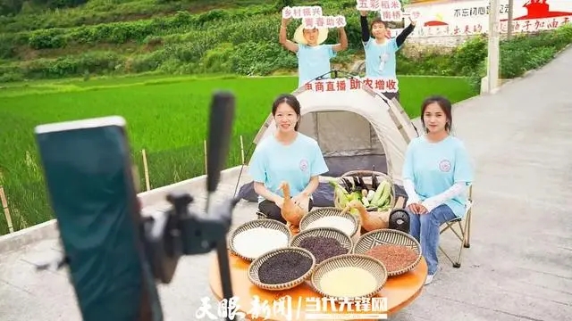 “五彩稻米分为紫米、黄米、黑米、红米、绿米五种色彩的稻米,稻米纯天然色泽、无污染、无公害,没有‘科技与狠活’……”社会实践团队在五彩稻米田旁上演了一场直播。