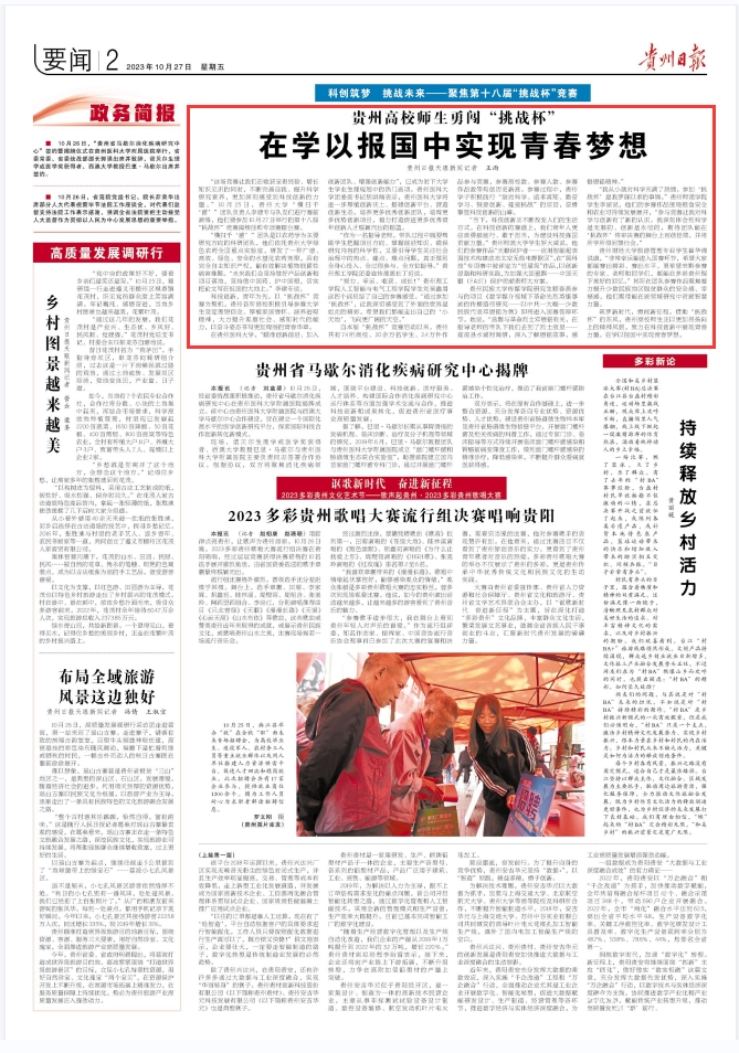 科技创新,青年为先。以“挑战杯”竞赛为契机,贵州各所高校积极引导参赛大学生坚定理想信念、厚植家国情怀、涵养进取精神,大力提升观察社会、感知时代的能力,以奋斗姿态书写更加绚丽的青春华章。