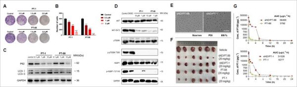 化合物PT-88对乳腺癌细胞株MCF-7具有较好的选择性和抗增殖活性(0.74μM),通过细胞克隆形成、划痕、周期阻滞、凋亡、自噬及信号通路抑制等实验考察了化合物的抗肿瘤机制。为改善优选化合物的药动学性质,课题组与复旦大学占昌友教授课题组合作,制备了PT-88及阳性对照PT-1的脂质纳米圆盘制剂(sND/PT-88和sND/PT-1)。结果显示,成制剂后PT-88的血浆暴露量提高了近10倍,半衰期及最大血药浓度均显著改善。值得注意的是,制剂同时极大地提升了化合物的体内耐受剂量(MTD)。BALB/c裸鼠药效学研究显示,20mg/kg剂量给药后(i.v.,QOD′10),sND/PT-88给药组的肿瘤生长抑制率(TGI)达到64.1%,显著优于sND/PT-1(55.9%)及游离药物PT-88组(45.6%),且具有较好的体内安全性。
