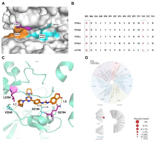 汤磊/张吉泉团队近年的主要研究方向之一是围绕恶性肿瘤及其发病机制,基于PI3K-Akt-mTOR信号通路开展创新药物研究,取得了系列创新性成果(J.Med.Chem.,2016,59,7268-7274;Eur.J.Med.Chem.,2020,204,112637;Eur.J.Med.Chem.,2022,229,114055;Bioorg.Chem.,2023,140,106781;Eur.J.Med.Chem.,2023,260115754.)。近期,该团队以泛PI3K/mTOR抑制剂PT-1作为工具分子,根据PI3Ks及mTOR蛋白序列上关键残基的不同,开展理性药物分子设计,经过两轮构效关系研究最终发现了高活性mTOR抑制剂PT-88(IC50:1.2nM)。激酶谱测试显示(196种激酶),PT-88专一性地结合mTOR,显示出极高的选择性。研究进一步通过分子动力学(MD)、关键残基自由能分解及丙氨酸扫描突变等技术对PT-88的分子结合模式进行了分析。