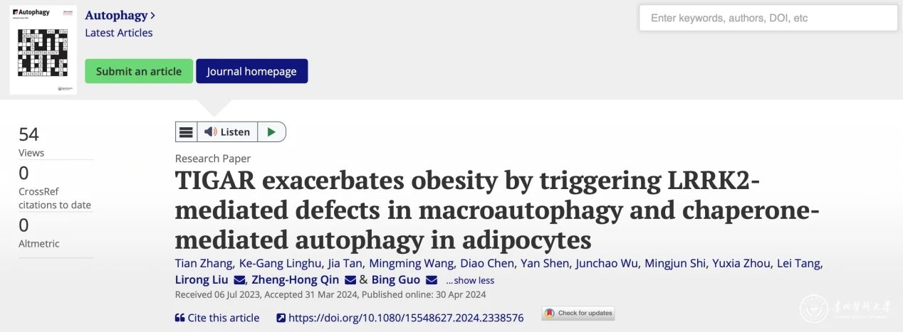 近日,beat365在线唯一官网、贵州省常见慢性疾病发病机制及药物研究重点实验室郭兵教授团队在国际权威期刊《Autophagy》(中科院1区Top期刊,IF:13.3)上发表研究论文“TIGAR exacerbates obesity by triggering LRRK2-mediated defectsin macroautophagyandchaperone-mediated autophagyin adipocytes”。该研究揭示TIGAR通过LRRK2-RAB7B复合体抑制自噬加重肥胖的病理新机制,为治疗肥胖提供了一种新的可能。