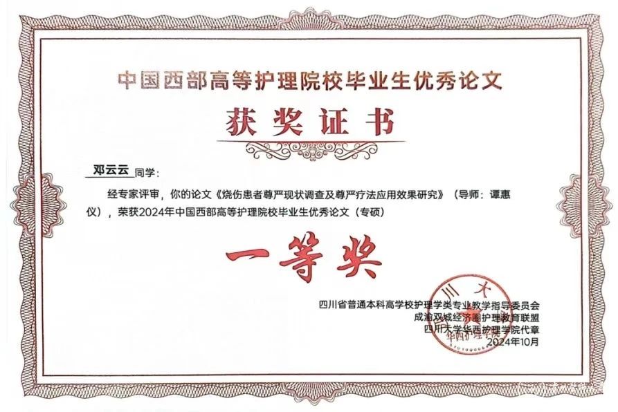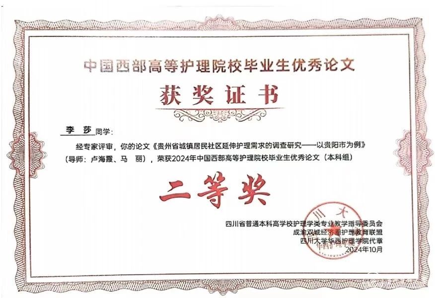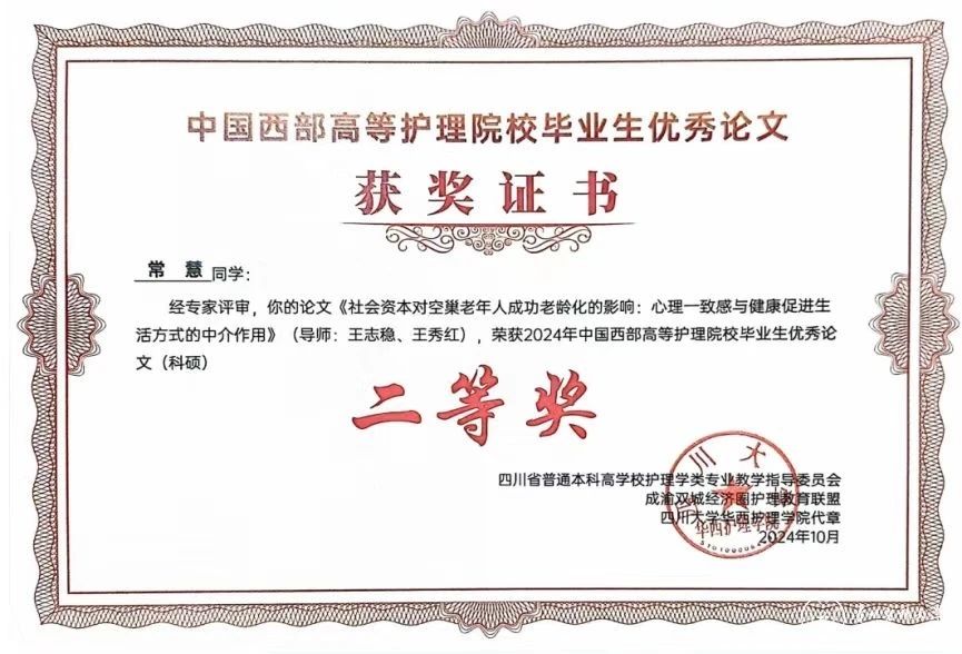 在此次优秀毕业论文评选中,2024届护理专硕毕业生邓云云,论文《烧伤患者尊严现状调查及尊严疗法应用效果研究》(导师谭恵仪主任护师)荣获专硕组一等奖;2024届科硕毕业生常慧,论文《社会资本对空巢老年人成功老龄化的影响心理一致感与健康促进生活方式的中介作用》(导师王志稳教授、王秀红主任护师)荣获科硕组二等奖;2024届本科毕业生李莎,论文《贵州省城镇居民社区延伸护理需求的调查研究--以贵阳市为例》(指导老师卢海霞副教授、马丽副教授)荣获本科组二等奖。