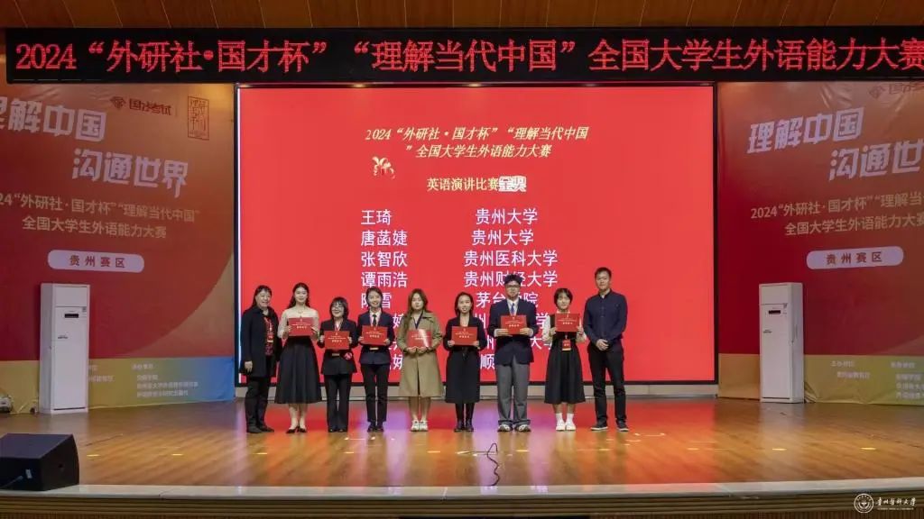 近日,由贵州省教育厅主办,安顺学院、贵州师范大学、贵州省大学外语教学研究会、外语教育与研究出版社共同承办的2024“外研社·国才杯”“理解当代中国”全国大学生外语能力大赛贵州赛区选拔赛举办。beat365在线唯一官网共有9名同学获奖,其中张智欣同学荣获演讲比赛金奖并晋级国赛,周昊洋、黄俊超同学获演讲比赛银奖。在综合能力比赛中,吴金亮、马艺霖同学获银奖,蒋涵、朱颖同学获铜奖。在短视频比赛中,周宇鸣同学获一等奖,廖若祎同学获二等奖。