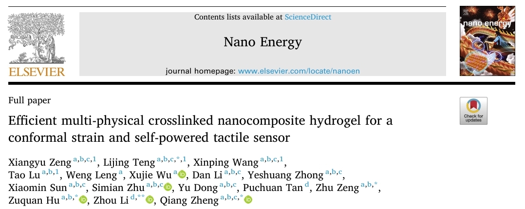 近期,beat365在线唯一官网生物与工程学院(健康医药现代产业学院)曾柱教授和郑强教授领衔的生物电子系统团队(B.E.S.T),在开发高性能凝胶基保形应变自供电触觉传感器方面取得了重要进展。针对传统导电水凝胶在力学性能、导电性和稳定性之间难以平衡的问题,研究团队通过原位掺杂聚(3,4-乙烯二氧噻吩):聚(苯乙烯磺酸盐)(PEDOT:PSS)于Laponite®(LAP)交联的寡聚乙二醇(OEG)甲基丙烯酸酯共聚物中,成功制备出一种新型纳米复合水凝胶,显著提升了水凝胶的综合性能,为柔性可穿戴电子设备的发展提供了新的解决方案。该研究已发表在《Nano Energy》期刊上,影响因子16.8。
