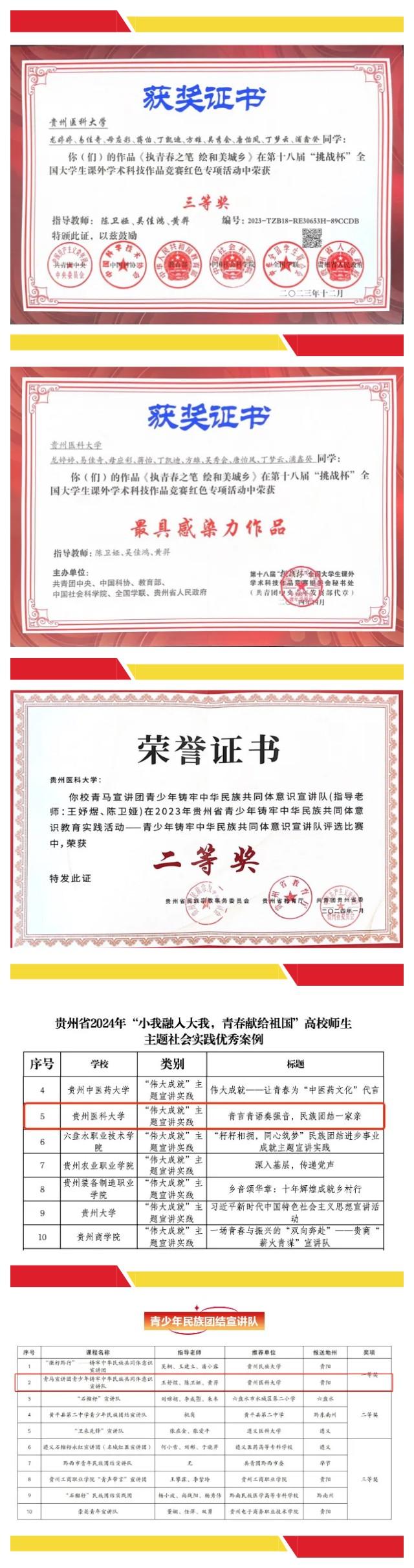 累计开展各类宣讲100余场,覆盖师生群众近2万人次;获得第十八届“挑战杯”国赛红色专项三等奖及最具感染力作品、2024年贵州省青少年铸牢中华民族共同体意识教育实践活动青少年民族团结宣讲队一等奖及主题团队课二等奖;连续两年获得省级“三下乡”社会实践活动优秀实践团队、贵州省高校师生主题社会实践优秀案例、2024年高校师生爱国主义教育实践活动短视频优秀作品三等奖等近20项国家级省级荣誉……