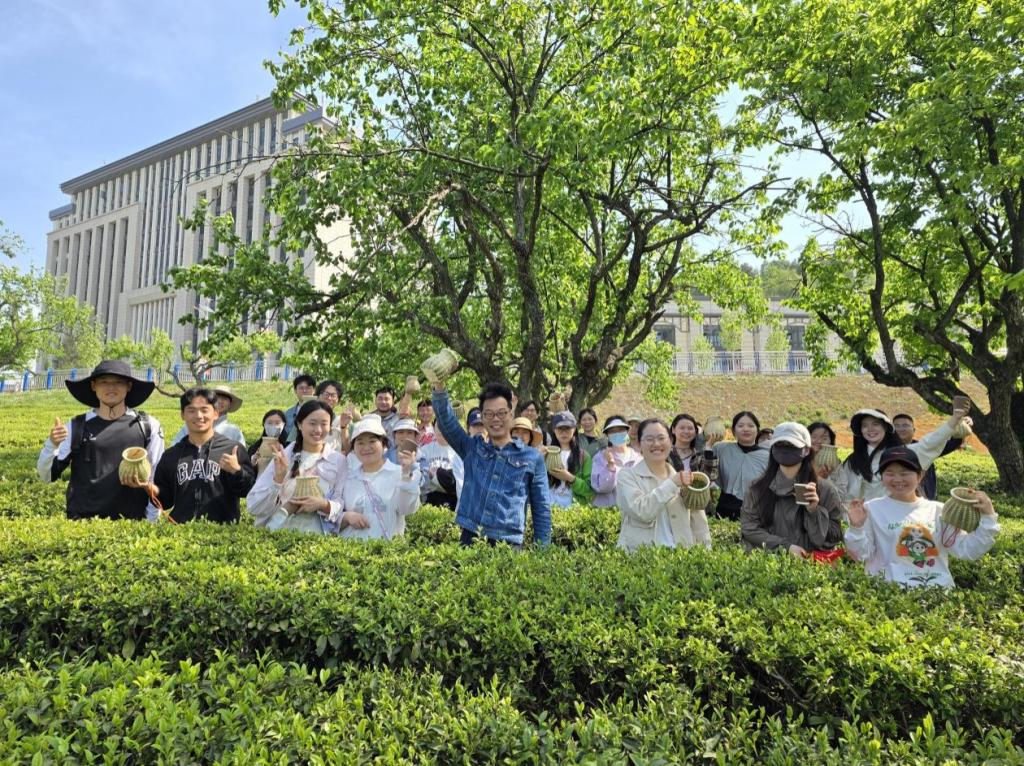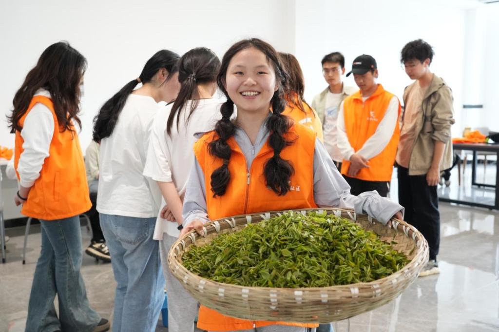 学生们分工协作,沉浸采茶之中,有采茶经验的学生,也会时不时与大家分享如何辨认茶叶品种,提高采茶效率的小技巧。活动现场不时传来学生们的欢声笑语。