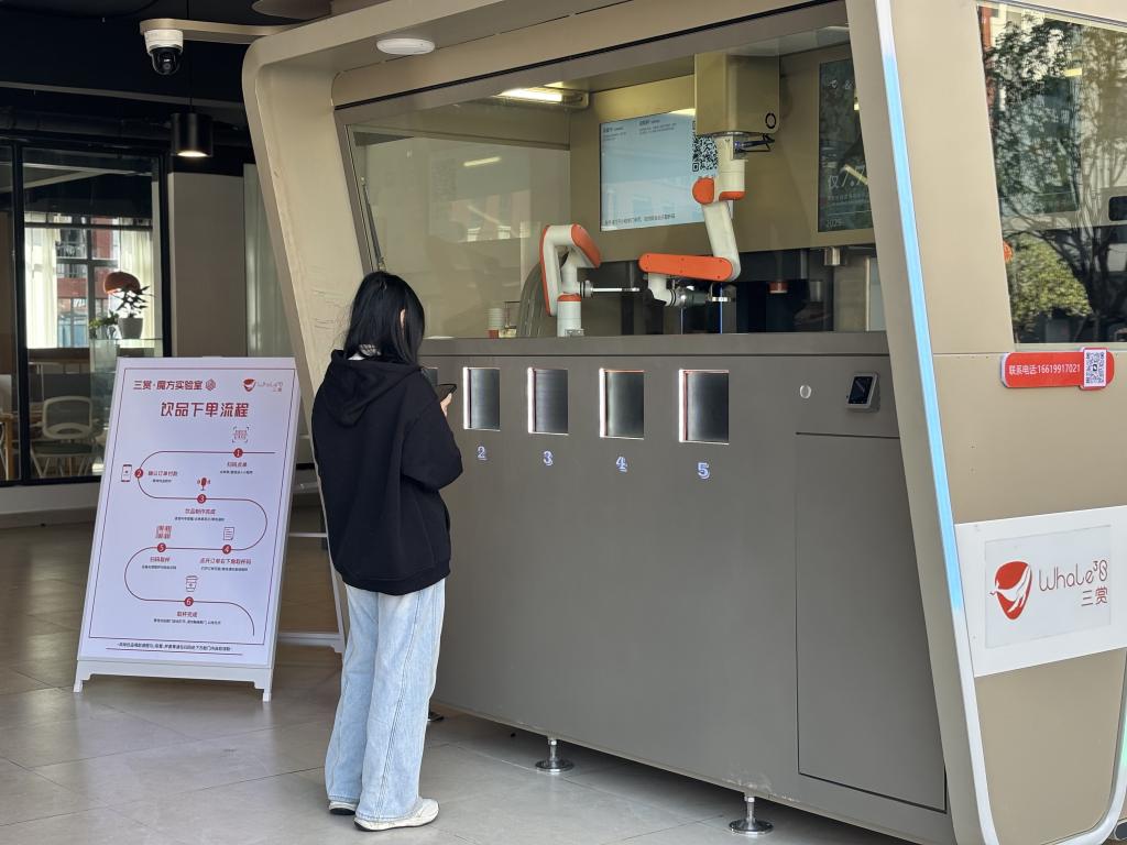 学生体验AI咖啡机器人。