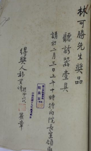 首届毕业生韩业传荣获林可胜先生赠送奖品
