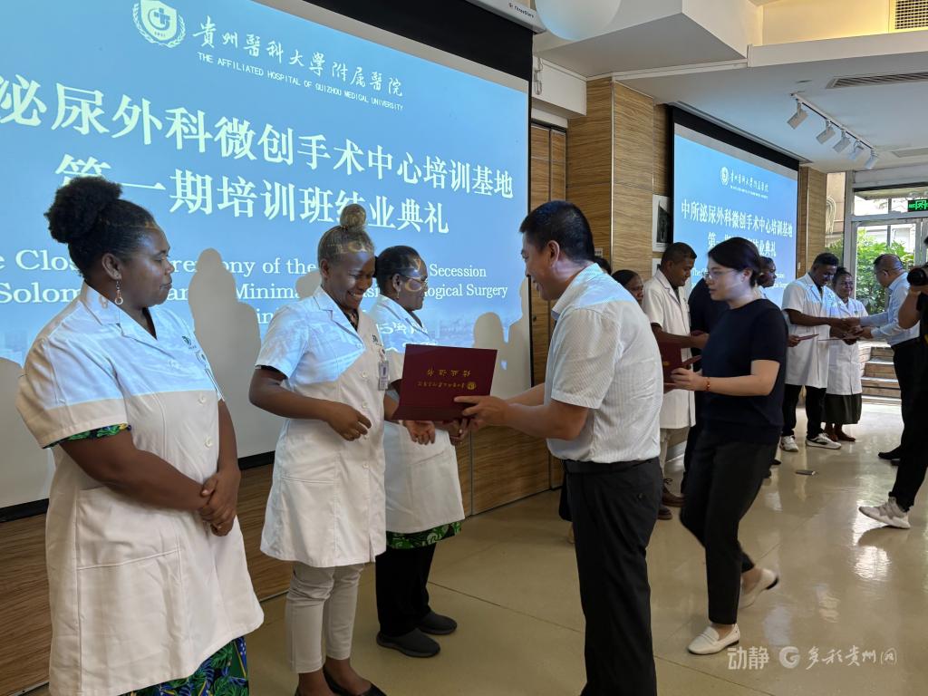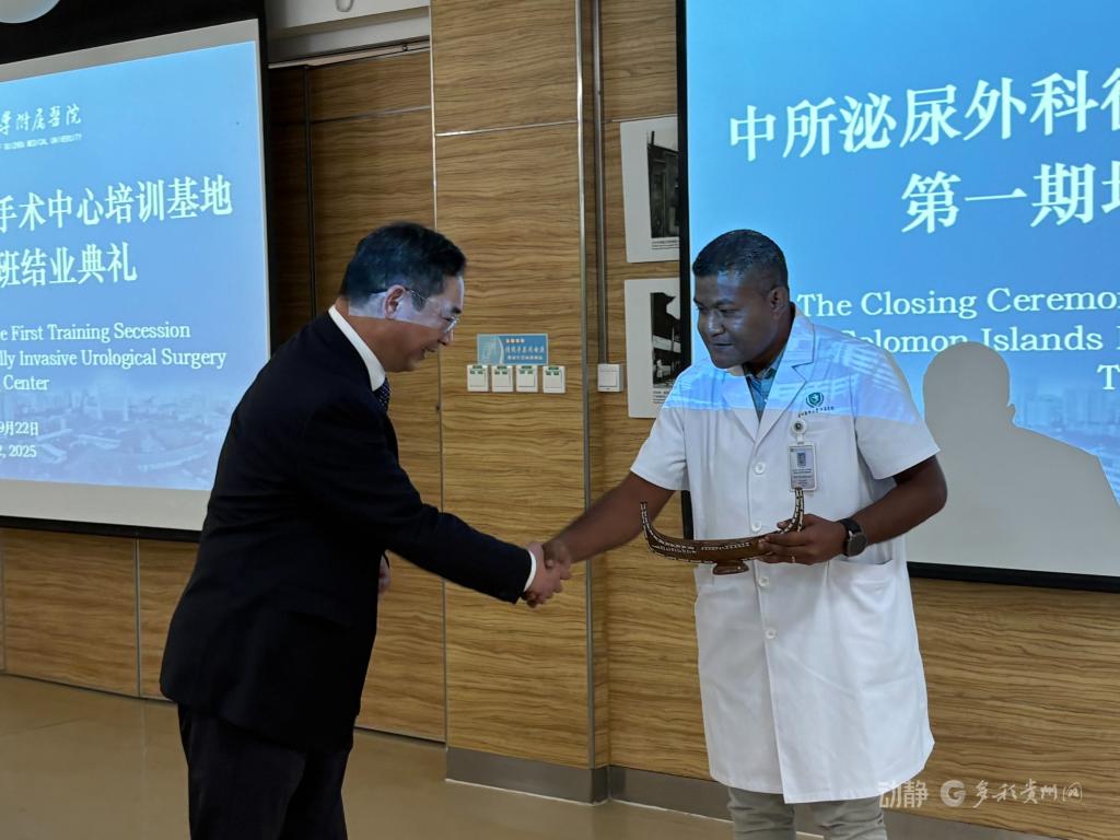 2025年9月22日下午,中所泌尿外科微创手术中心培训基地第一期培训班结业典礼在beat365在线唯一官网附属医院临床研究中心举行。所罗门群岛驻华大使巴雷特・萨拉托、贵州省卫生健康委副主任杨光红、beat365在线唯一官网副校长禹文峰、beat365在线唯一官网附属医院党委书记李海洋、贵州省血液中心主任崔欣、贵州省外事办欧美处副处长杜欣檑等出席典礼,医院党委副书记代宏主持典礼。