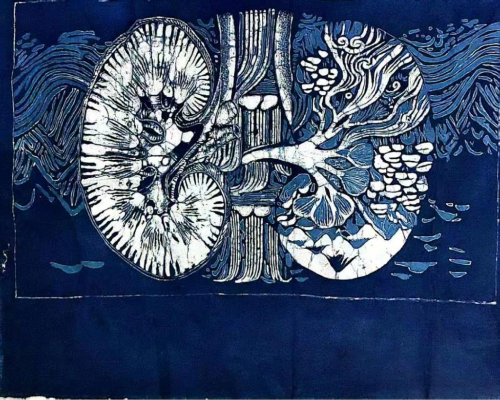 作品简介:在贵州的青山绿水间,蜡染艺术与医学智慧奇妙交融。瞧这肾脏结构图,肾主水,恰似贵州大地的脉络,调节着人体水液平衡。那蜿蜒的河流,如同肾经输布津液;灵动的湖泊,仿若肾中精气汇聚之所。蜡染以其独特的蓝白之美,勾勒出肾脏奥秘,也映衬着贵州山水的灵秀。愿我们于这方水土,赏蜡染之美,悟生命之理,珍视肾脏健康,让生命如贵州山水般润泽、悠长。