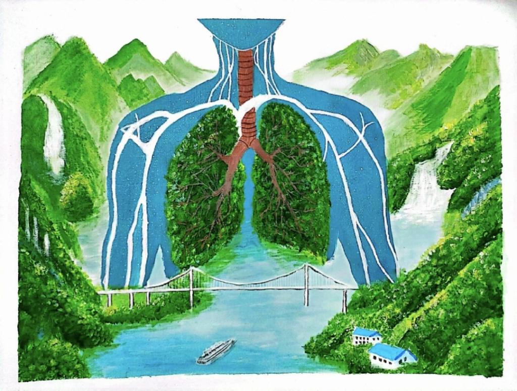 作品简介:作品将国家的壮丽山水与人体的肺脏巧妙结合,山脉和河流如同肺中的支气管和血管网络相得益彰。跨河大桥将自然生态与人体呼吸系统联系在一起,象征着人与自然的纽带,同时作品也融合了中医“天人合一”的理念。