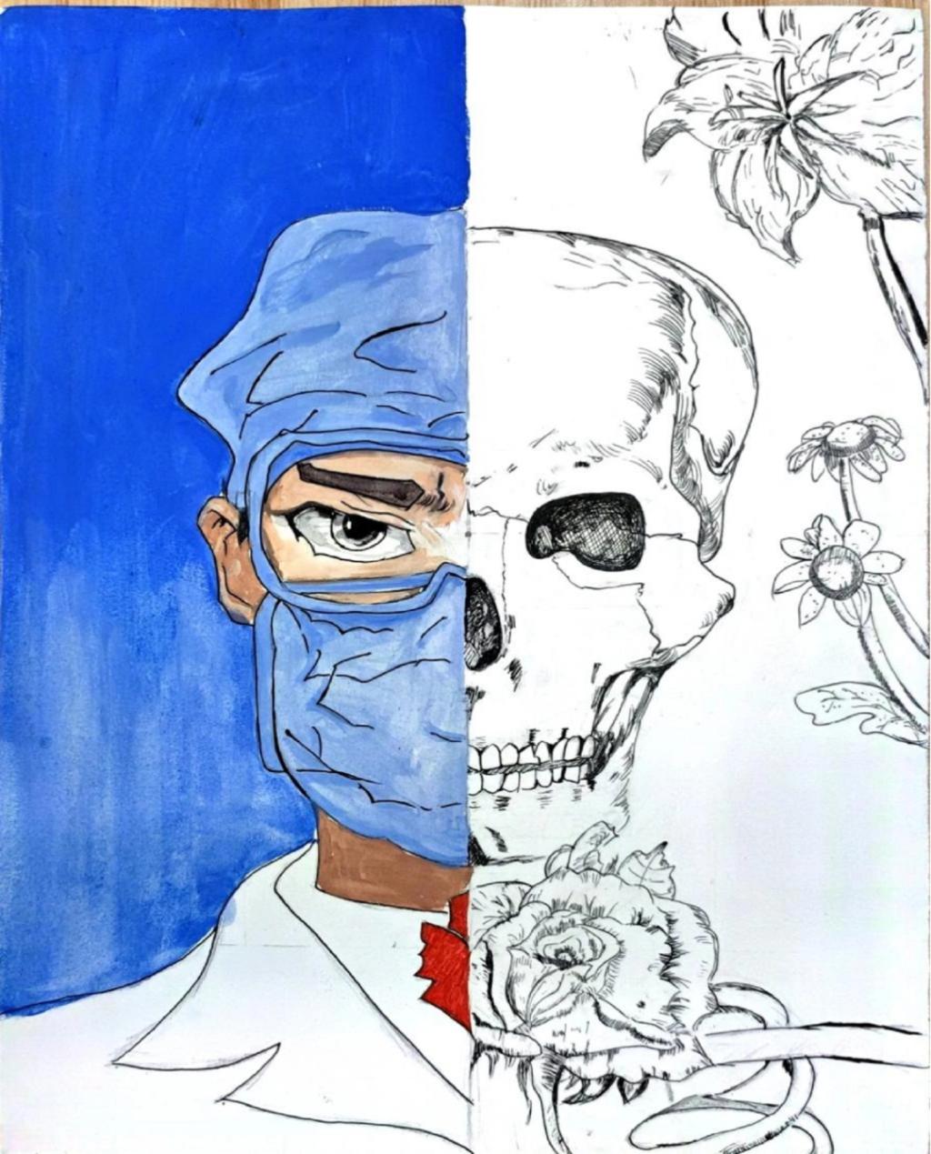 作品简介:作品画面以对半构图呈现,左侧是身着白衣、配备防护装备的医护形象,代表医学对生命的守护;右侧骷髅与花卉交织,骷髅体现解剖学根基与对死亡的理性认知,花卉则暗喻生命的绚烂与敬畏。该作品是医学与艺术的结合,借助视觉张力,展现医学生在专业路途中,对生命守护的担当与对生死命题的人文哲思,引发医学本质与生命价值的深层思考。