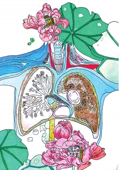 作品简介:作品将人体肺部解剖结构与莲花、莲叶创意融合。以线条勾勒细节,色彩清新,借莲之洁净喻肺之清宁,打破常规视角,在医学严谨与艺术美感间寻平衡,传递对健康、纯净的祈愿,是医学与艺术跨界的独特表达。