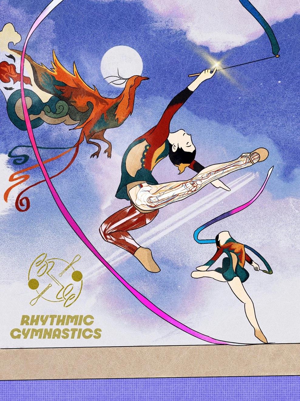 作品简介:作品灵感源自巴黎奥运会上中国艺术体操团体夺金节目《凤鸣凌霄》。汉唐胜景尽显,形体之美与东方之美兼具,寓意着凡人之躯也能一展凤凰姿韵。