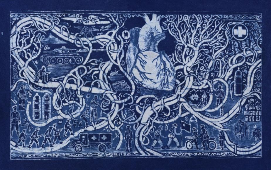 作品简介:作品采用蜡染的手法,以错综血管与跃动心脏为核心意象。血管如战场生命线,交织前线与后方,寓意救死扶伤之神圣使命。展现生命于战火中的坚韧与脆弱,颂扬医护人员无畏于艰险,于硝烟中织就生命希望之网。