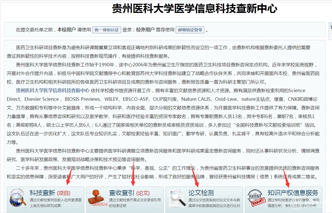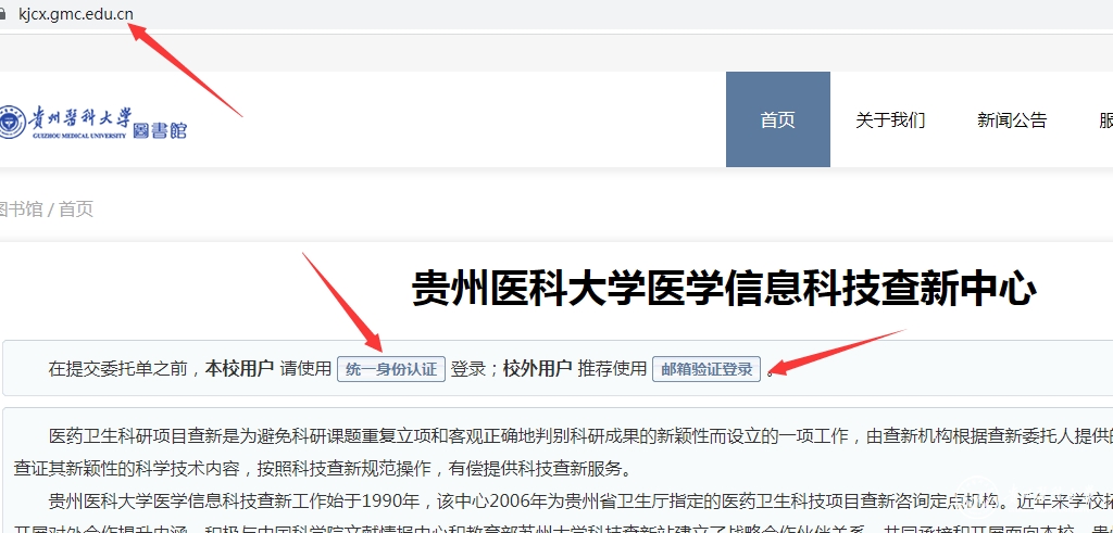 (1)进入beat365在线唯一官网科技查新工作站(网址:https://kjcx.gmc.edu.cn/)后,校内用户点击“统一身份认证”进行登录,校外用户使用“邮箱验证”方式登录。