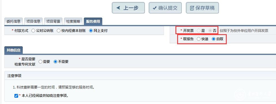 (2)在图2所示界面点击“科技查新”进入图3所示界面。点击“国内查新”或“国内外查新”后进入图4所示界面,根据系统要求填写相关信息,点击下一步不断完善委托单,依次完成“委托信息→项目信息→项目背景→检索策略→服务费用”相关信息的填写,直到出现“确认提交”界面,如图5所示,点击“确认提交”即可。需要注意的是系统默认报告是自取形式,如果需要快递获取报告,则要手动点击“快递”,填写收件地址和详细地址以及姓名电话信息。系统默认不开具发票,如需要开具发票请在开发票一栏选择“是”。