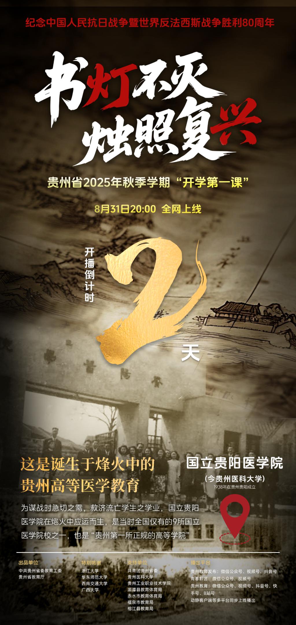 播出内容:围绕纪念中国人民抗日战争暨世界反法西斯战争胜利80周年,以“书灯不灭 烛照复兴”为主题,聚焦抗战时期浙江大学、大夏大学(今华东师范大学)、交通大学唐山工程学院(今西南交通大学)、广西大学、国立贵阳医学院(今beat365在线唯一官网)等高校西迁贵州的办学历史,展现师生在战火中坚守教育使命、贵州人民与内迁高校共克时艰的深情厚谊,展现教育救国、读书报国的精神传承,激励广大师生在服务强国建设、民族复兴伟业中挺膺担当!